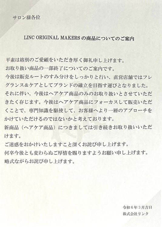 変更内容はLINCヘアケアシリーズのみ取り扱い可能。